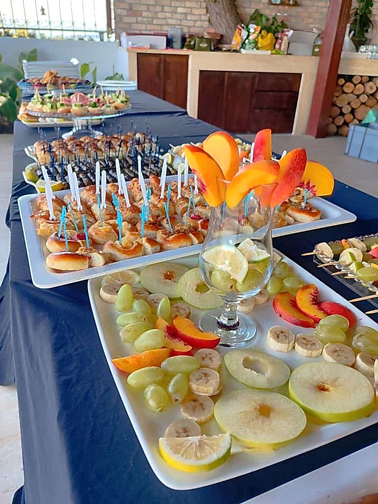 - Taze meyve tabakları, mini kuplar, tatlı kurabiyeler