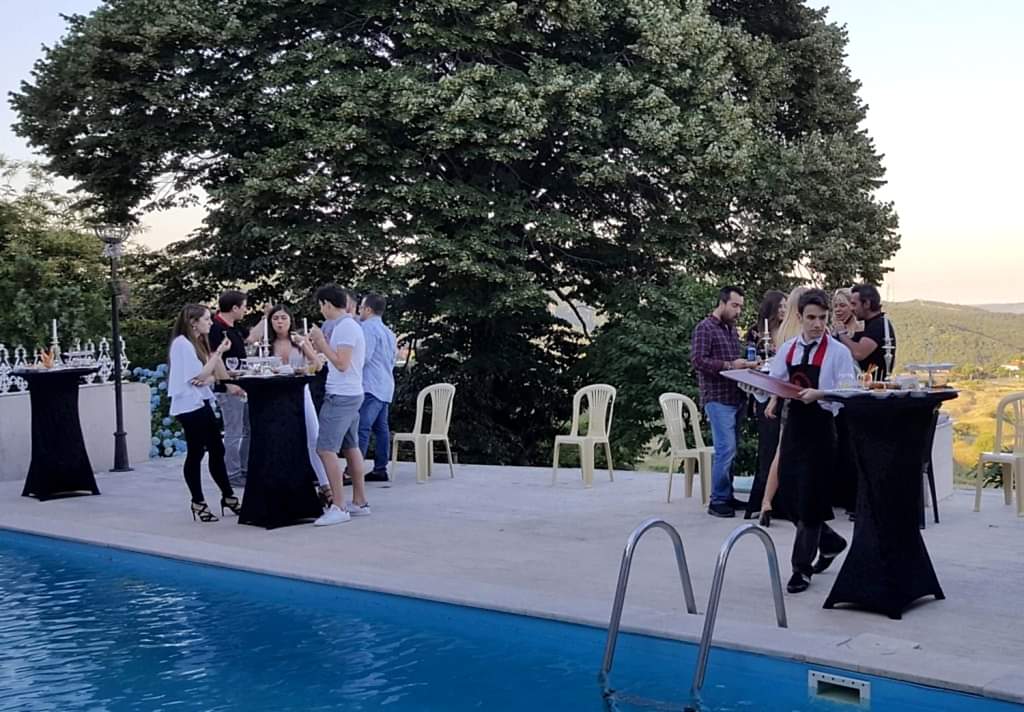 - Kokteyl menüsü, bistro masalar ve sunumlu ikramlar